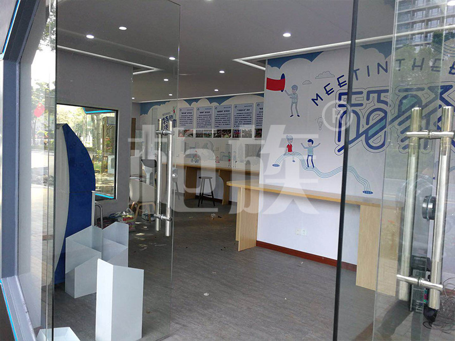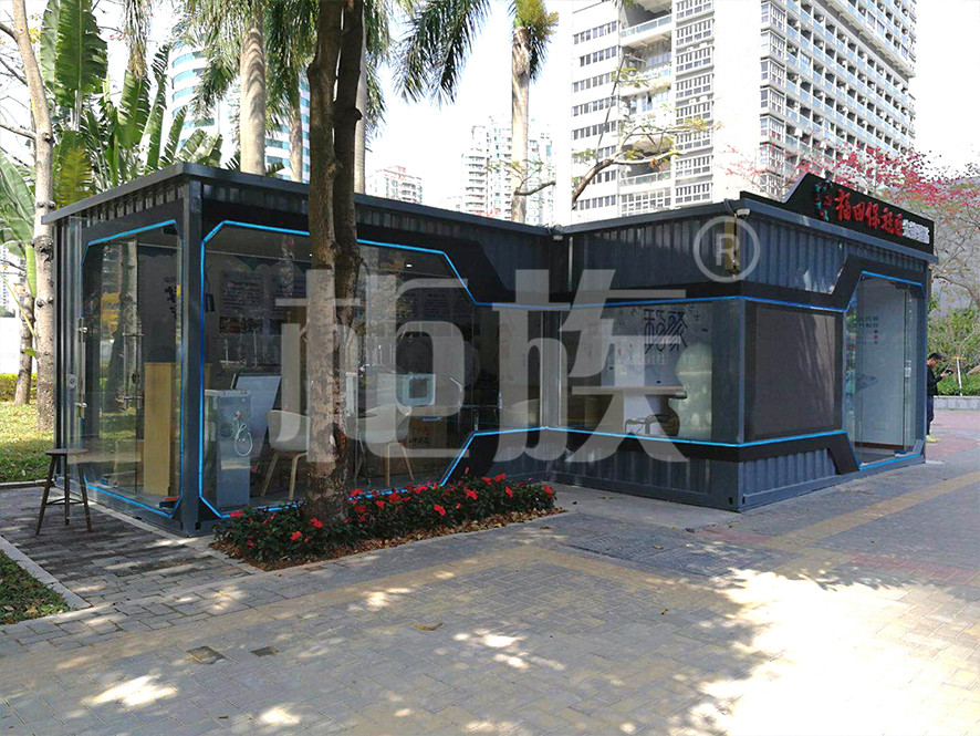 驛站使用兩個集裝箱錯位串聯而成,正面墻體使用大面積玻璃門窗,線條流暢、棱角分明,造型時尚,通透亮堂,很好地突出了驛站的標志性與開放性特點。